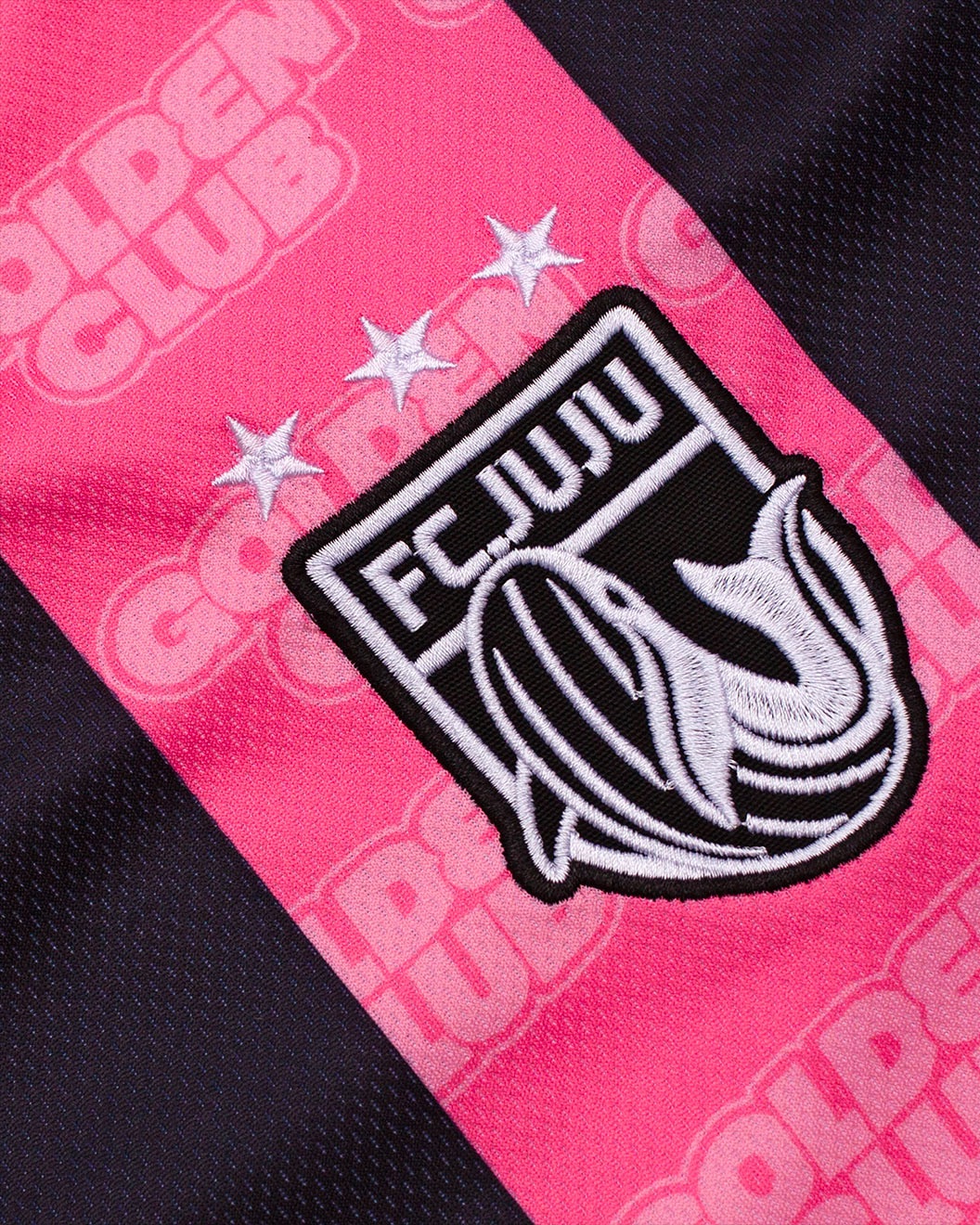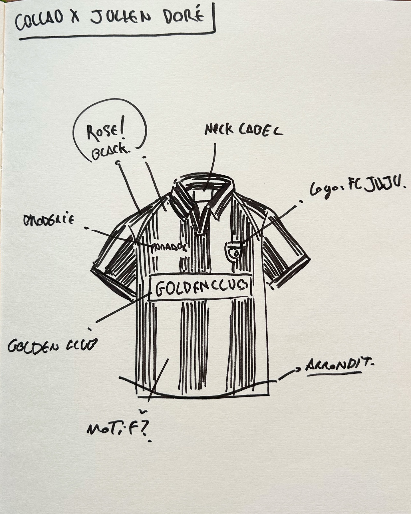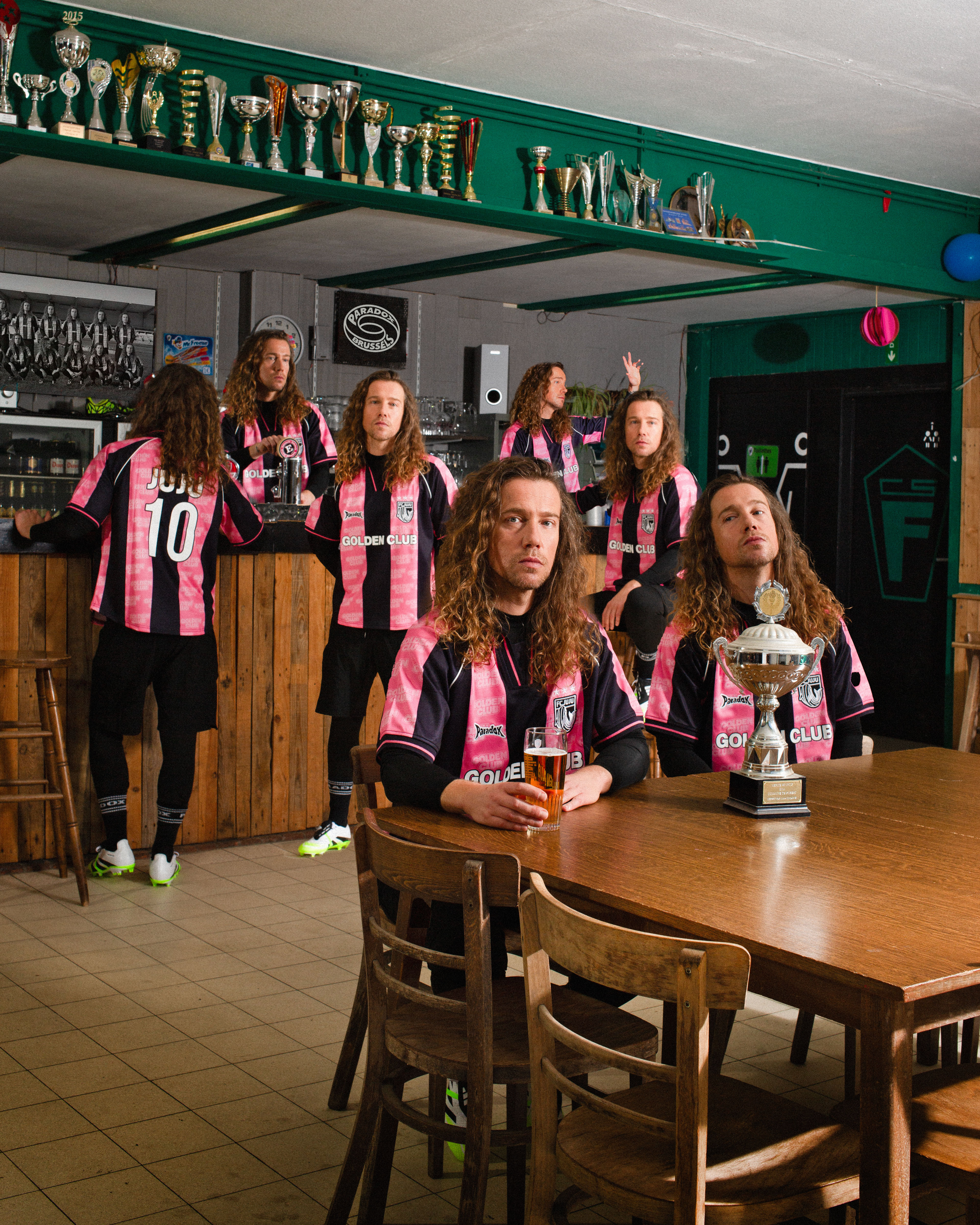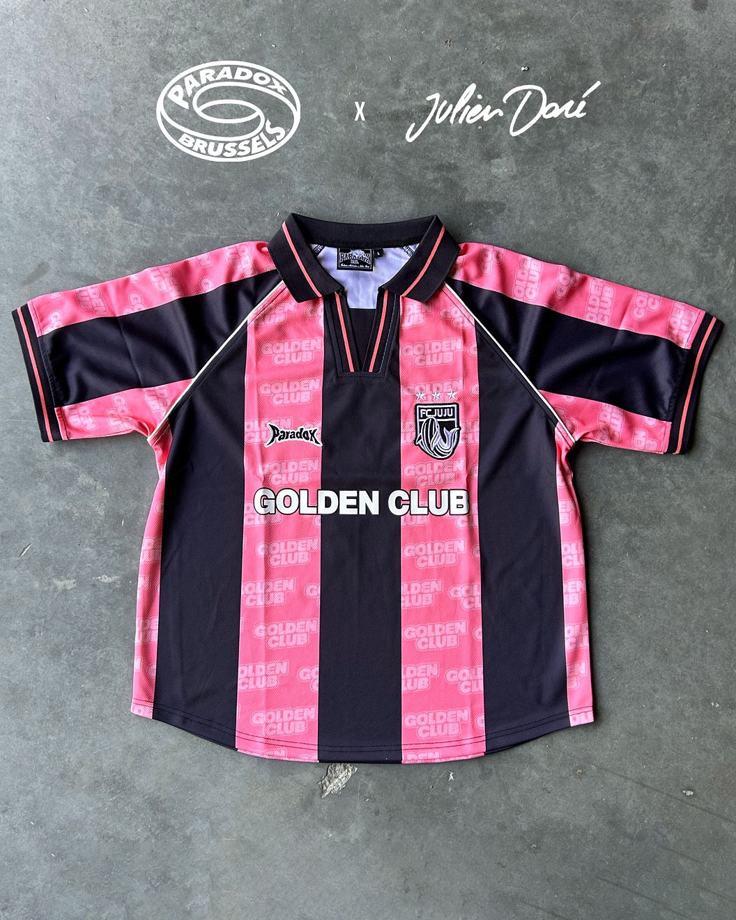 Le maillot Julien Doré, avec son allure vintage - rayures roses et noires, la mention Golden Club, le numéro 10 dans le dos et le flocage FC Juju - reflète parfaitement la vision de Paradox Brussels : utiliser le vêtement comme une plateforme narrative et un puissant outil de communication.