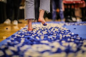 Wat : per opgehaalde euro wordt blootsvoets 10 cm gelopen over pijnlijke Legoblokjes. Opbrengst : 720€