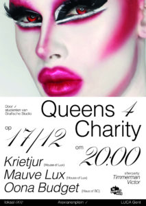 Wat : het organiseren van een DragQueen performance (Krietjur, Mauve Lux, Oona Budget) + DJ set (Timmerman) met party op campus LUCA School of Arts. Opbrengst : 1040€