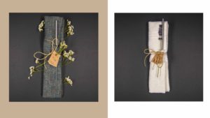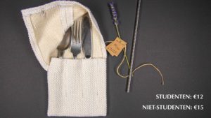 Wat : zero waste bestek (combinatie mes/vork/lepel opgehaald in kringloopwinkels) in design-tasje (restanten meubelstof) als alternatief voor plastic wegwerpbestek. Opbrengst : 1024€