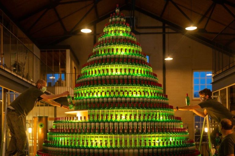 Filliers Distillery bouwt kerstboom met 2.000 flessen graanjenever