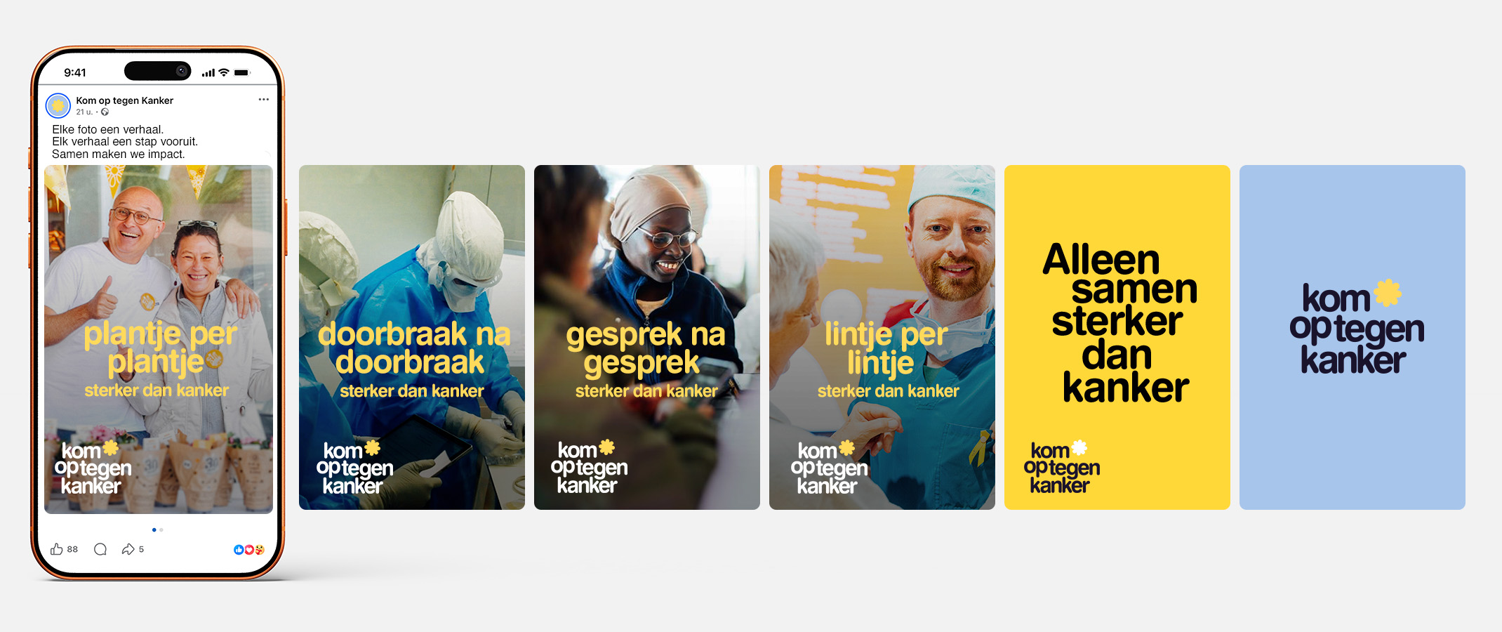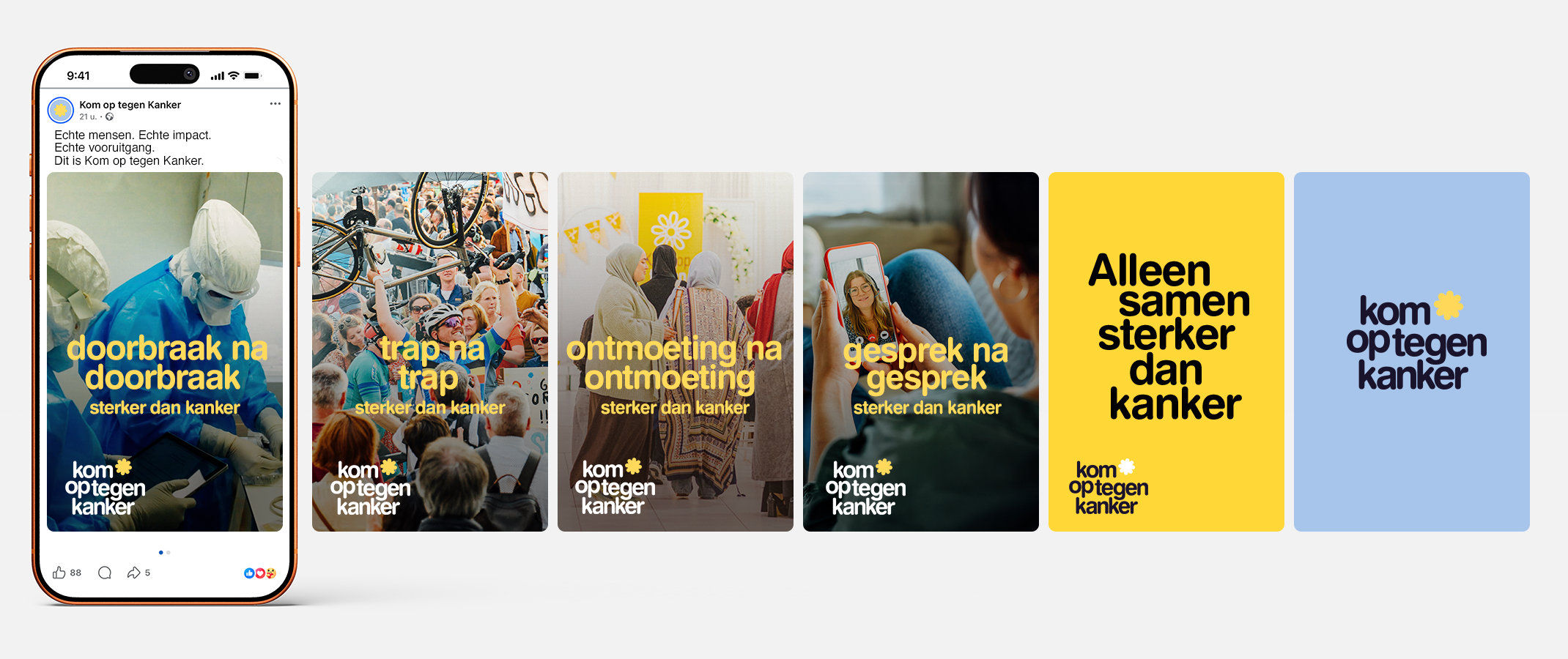 Tegelijk krijgen steeds meer mensen kanker. Dit is dus hét moment om de strijd volop aan te gaan. “Acties voeren, oproepen lanceren, mensen mobiliseren - dat doen we al jaren. We willen tonen aan de buitenwereld wat ons uniek maakt: we ondergaan niet, we ondernemen altijd samen. Van vrijwilligers tot onderzoekers, van zorgpersoneel tot beleidsmakers. Met de patiënt centraal. Maar om de eindsprint in te zetten, hebben hebben we nu echt iedereen nodig. Om nog meer en sneller doorbraken te realiseren voor patiënten en hun naasten. Met die briefing stapten we naar BBDO,” zegt Petra Baeck, directeur marketing & fondsenwerving van Kom op tegen Kanker.